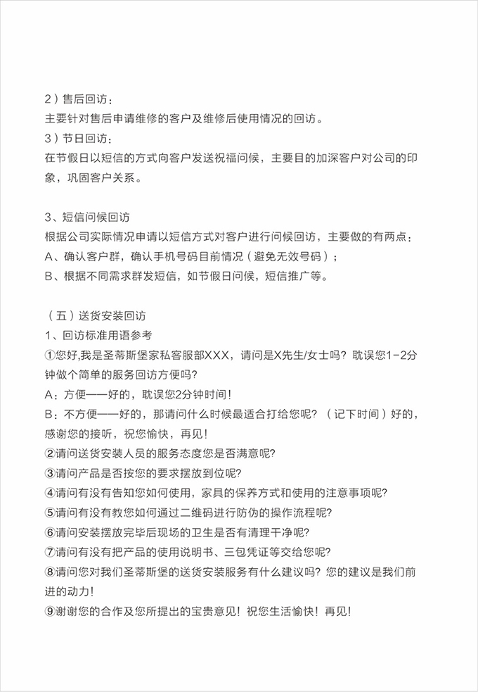 話術(shù)參考:“**先生/女士您好,我是圣蒂斯堡的售后服務(wù)人員**,您購(gòu)買的圣蒂斯堡家具已經(jīng)全部到貨了,送貨安裝大約需要**時(shí)間,請(qǐng)問(wèn)您這邊什么時(shí)候方便我們上門送貨安裝呢?”同時(shí)要了解送貨小區(qū)的電梯、樓道、入戶門的尺寸等,提前做好準(zhǔn)備,避免意外情況。最后確定送貨時(shí)間(安裝所需要時(shí)長(zhǎng)),并告知客戶安裝人員的相關(guān)信息,可加微信發(fā)送,并發(fā)送配送安裝流程說(shuō)明。
