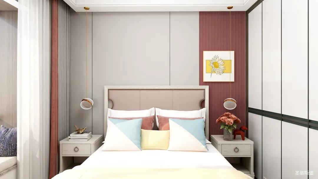 兒童空間雖不及其他空間寬敞,但細(xì)節(jié)設(shè)計(jì)更為貼心,淡粉的床屏與酒紅木飾面形成深淺色的對(duì)比,色彩跳躍,洋溢著兒童應(yīng)有的青春活力。床前的閱讀燈,讓空間設(shè)計(jì)感up的同時(shí),也便利了兒童的閱讀學(xué)習(xí)。