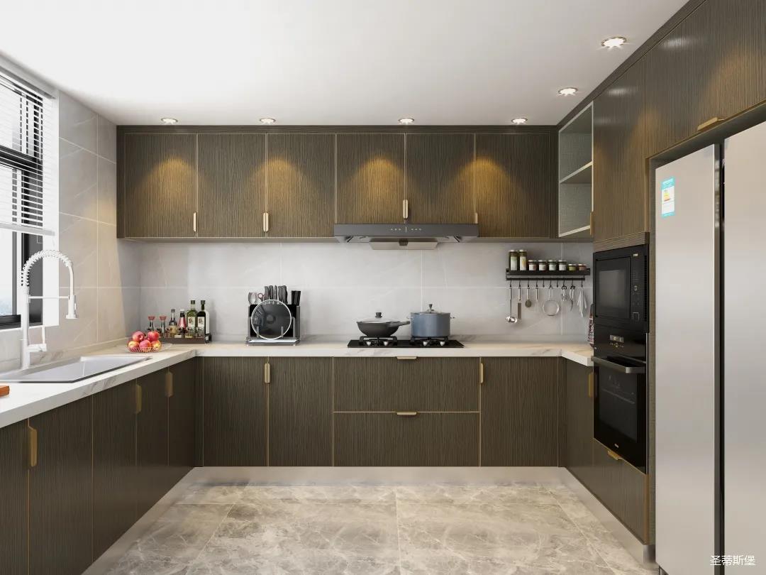 u型空間格局,設(shè)計師將功能區(qū)合理劃分,讓洗切煮一氣呵成。以米白水磨石+英倫爵士灰實木為主導(dǎo)的櫥柜系統(tǒng)中,人體工學流線,讓每一細節(jié)都折射出屋主對生活的考究,一廚一柜,每一處都關(guān)乎著我們對生活的熱忱。