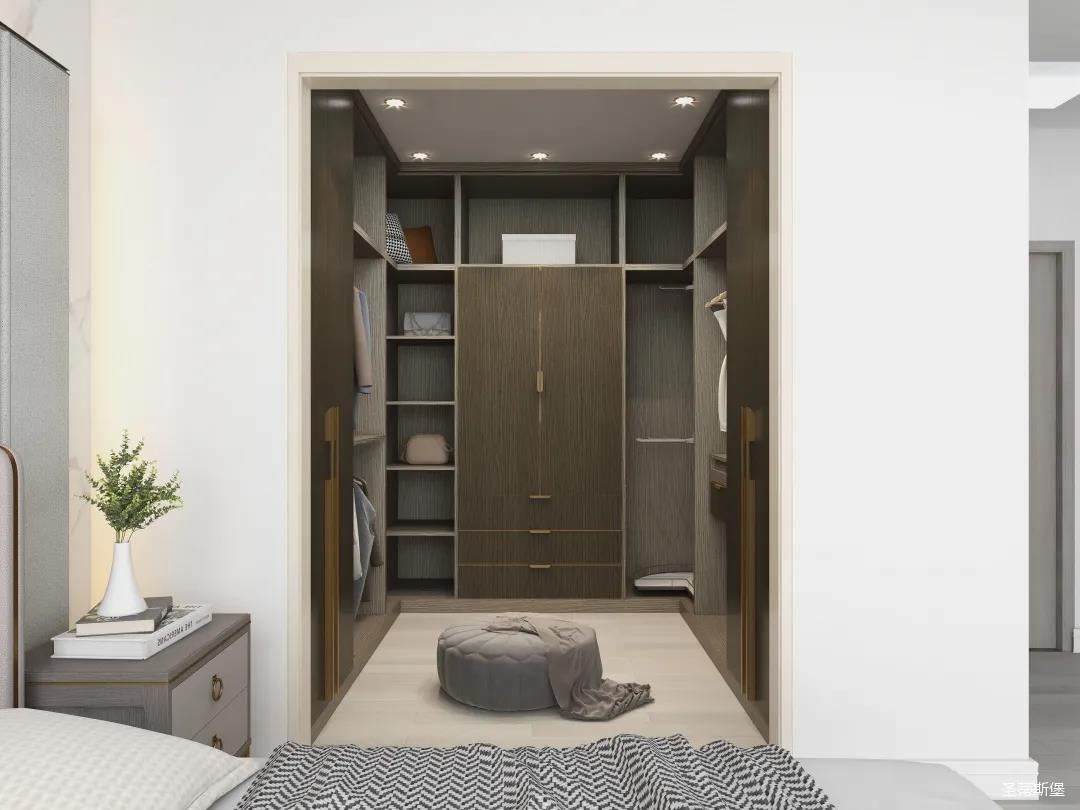 衣帽間進行u型設(shè)計,全落地定制形式,融匯了簡奢風格獨具的浪漫與優(yōu)雅。金屬、實木拼接細節(jié)與天然材質(zhì)為衣帽間注入與眾不同的高級氣質(zhì)!開放式的懶人布局,讓衣物收納一目了然,能同時滿足疊放與掛衣功能,實現(xiàn)了“一柜多用”。