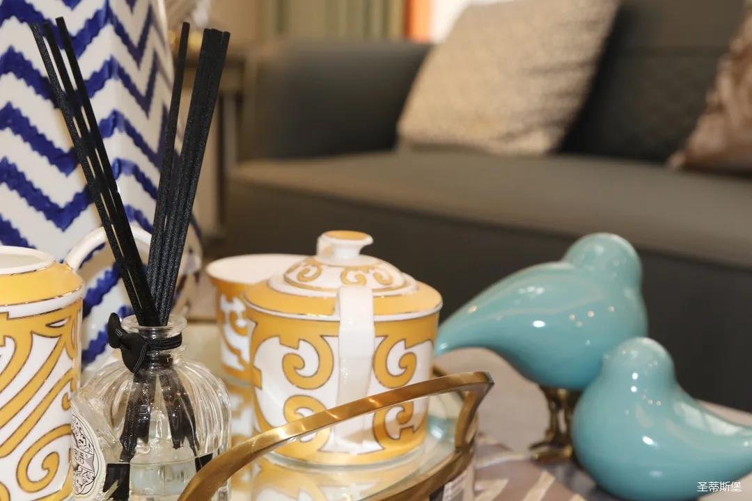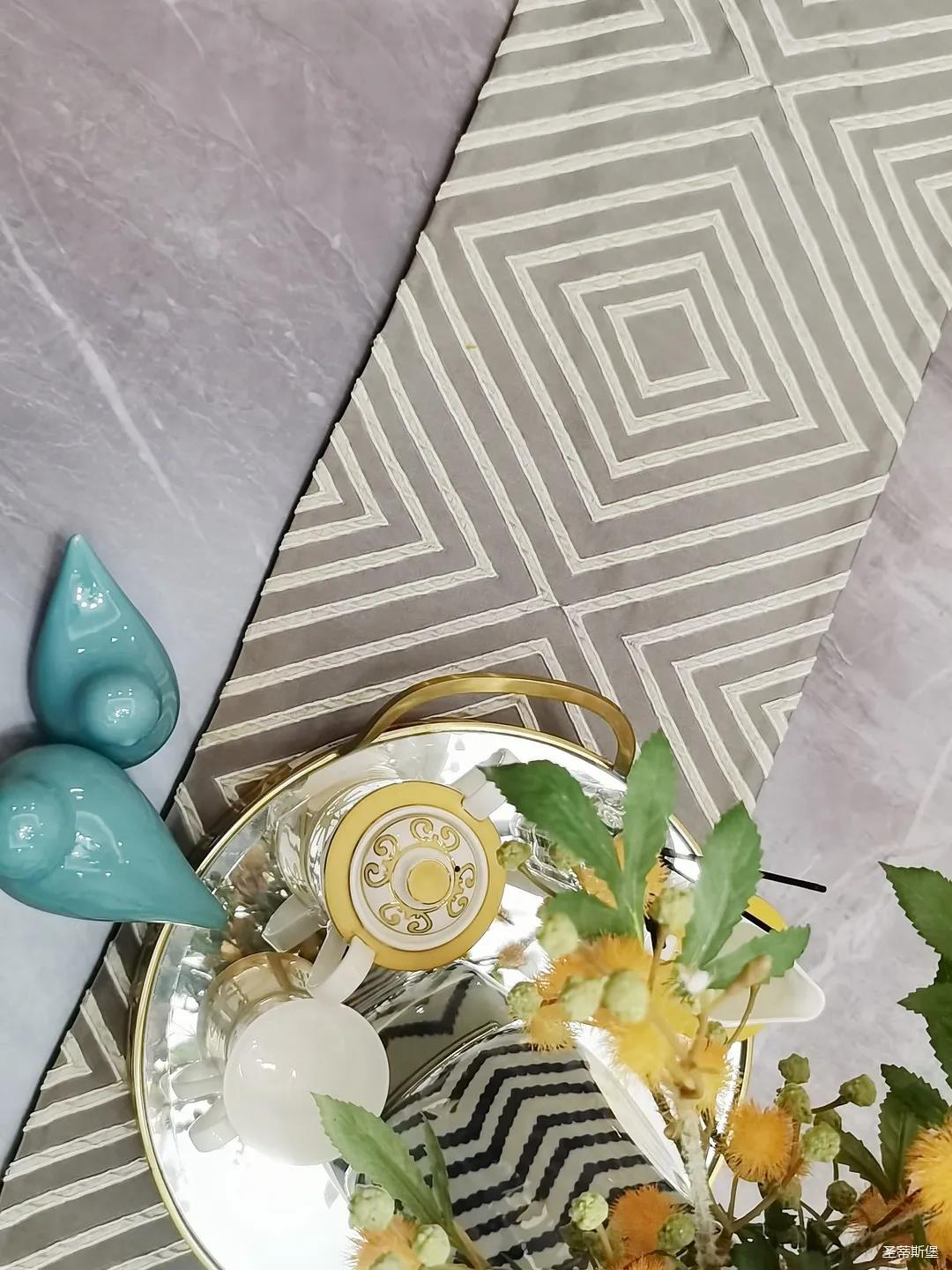 淺灰為基底的飾面與低飽和度的深色沙發(fā)相互映襯,產(chǎn)生強(qiáng)烈的視覺沖擊,深色的家具讓空間從視覺上衍生出一種縱深感。巖玻的質(zhì)感與真皮編織的紋理盡顯現(xiàn)代之美,細(xì)節(jié)陶瓷擺件注滿了空間優(yōu)雅的藝術(shù)氛圍。