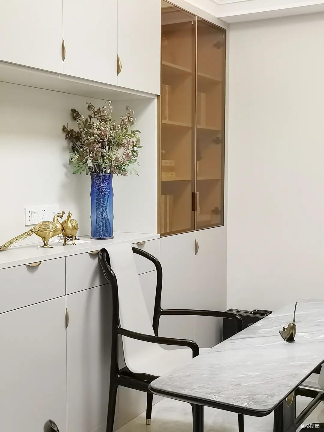 開放式的餐廚設(shè)計(jì)讓餐邊柜和櫥柜的居家動(dòng)線更為流暢,成了最便利的收納場(chǎng)所,生活小資而又美好。