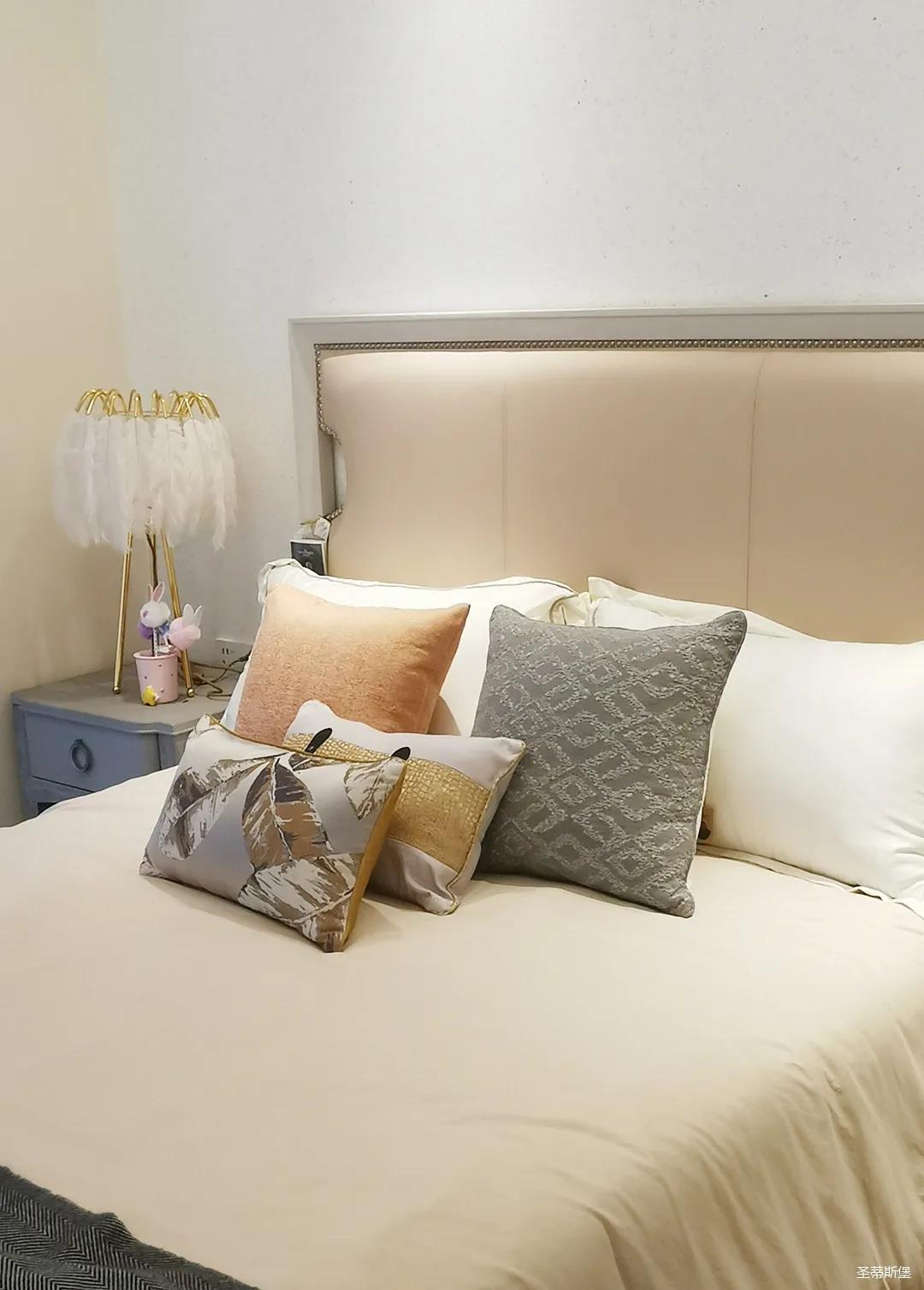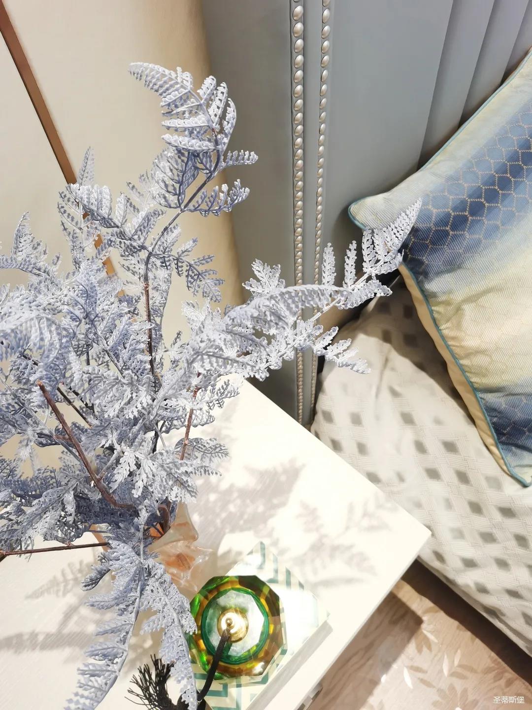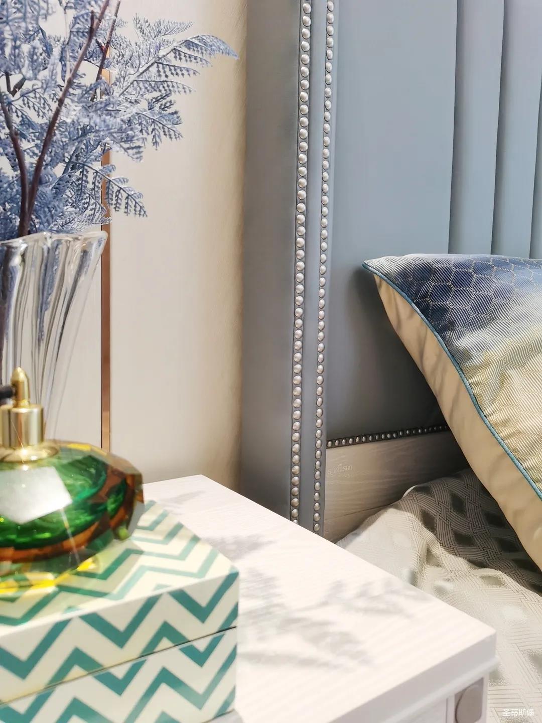 一樓的房間業(yè)主是作為長(zhǎng)輩房,采用輕奢的背景墻面,結(jié)合亮眼的金屬線條設(shè)計(jì),空間顯得時(shí)尚又不失沉穩(wěn)。莫蘭迪色的淺藍(lán)床屏,在無主燈設(shè)計(jì)與自然光線的碰撞下醞釀出不同的光影美感。