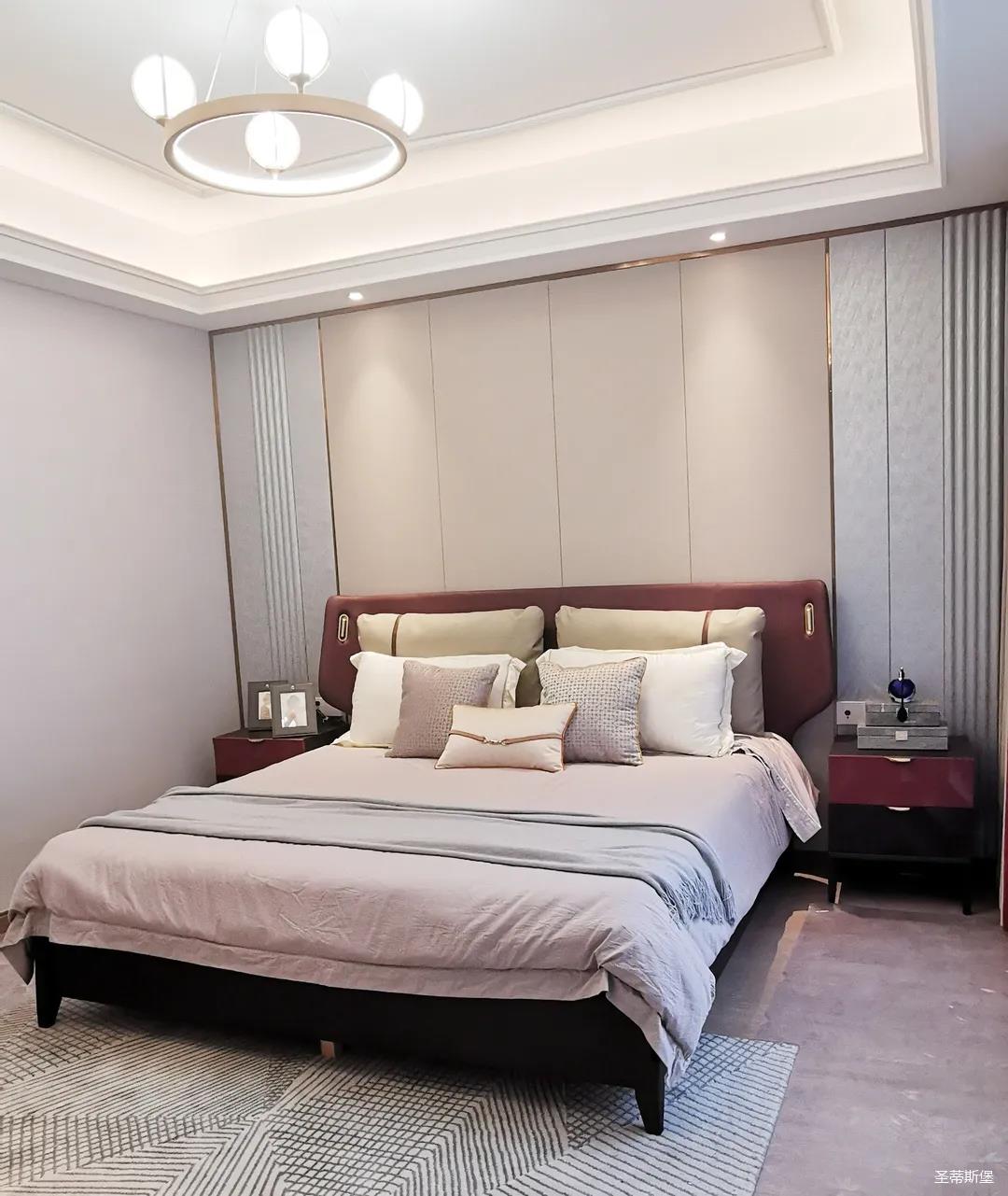 三樓的主人房設(shè)計(jì)風(fēng)格更偏向簡(jiǎn)約,浪漫的酒紅色床屏運(yùn)用了曲面造型,融合了極簡(jiǎn)主義美學(xué)和輕奢元素,小型夜間感應(yīng)燈設(shè)計(jì)讓每一處細(xì)節(jié)都充滿著時(shí)尚優(yōu)雅的氣息。夜間倚靠在厚實(shí)的軟包上,時(shí)光好像在不知不覺中慢了下來,讓我們能品味和咀嚼生活的氛圍。