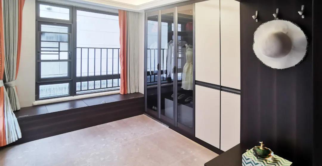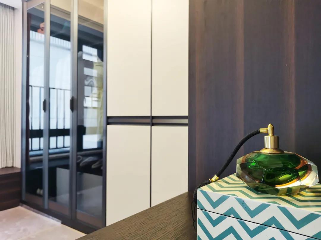 衣帽間以現(xiàn)代極簡(jiǎn)設(shè)計(jì)手法引入輕奢元素,借助實(shí)木與金屬組合打破了傳統(tǒng)儲(chǔ)物區(qū)的沉悶感,煙熏色橡木紋的定制柜體,色澤好似一杯溫暖醇香的摩卡,令空間層次感與立體感的格調(diào)頓生,予以沉穩(wěn)舒適感官體驗(yàn)。